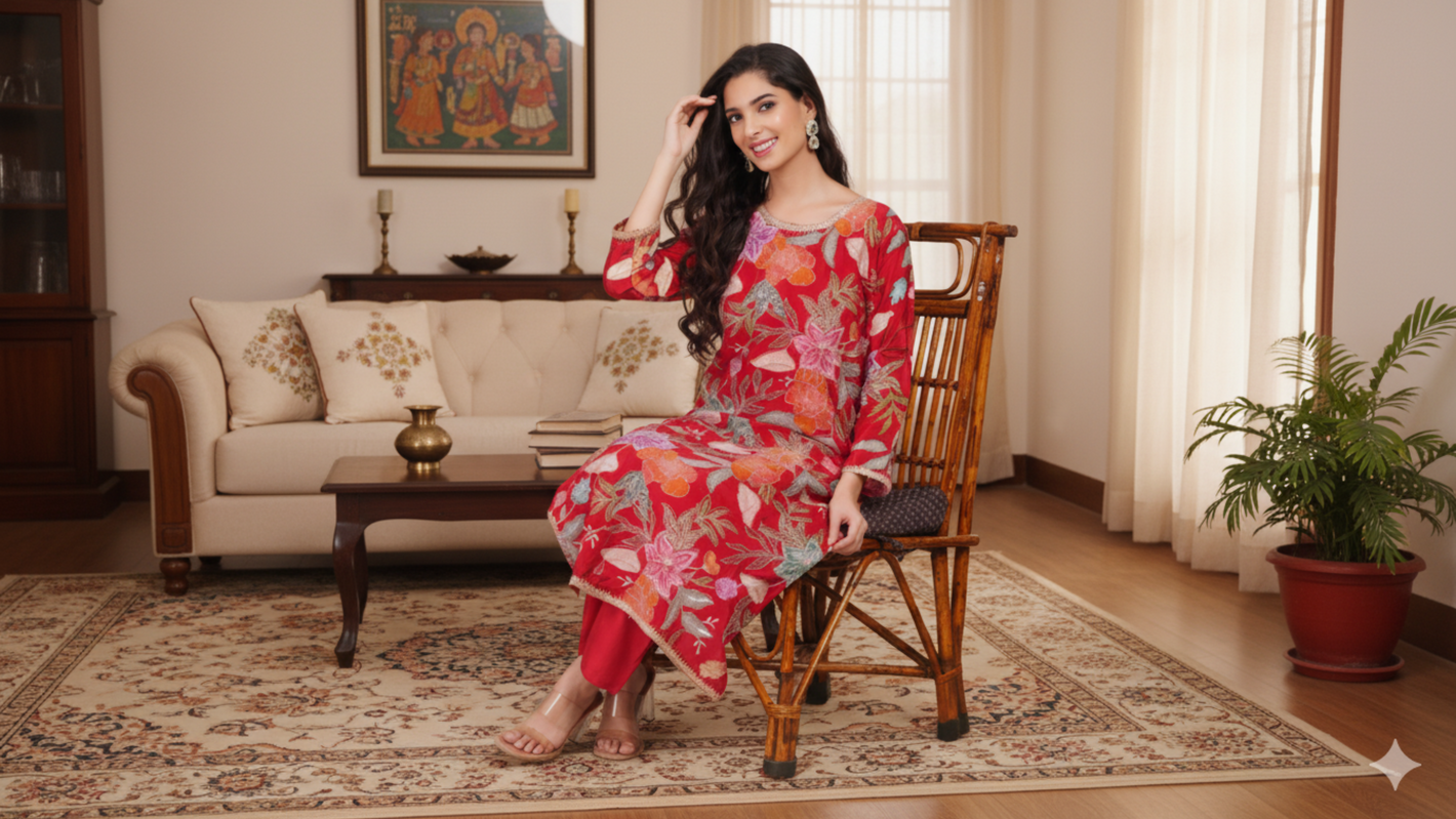 Red Jari Dabka Organza Kurti Set – Festive Wear
