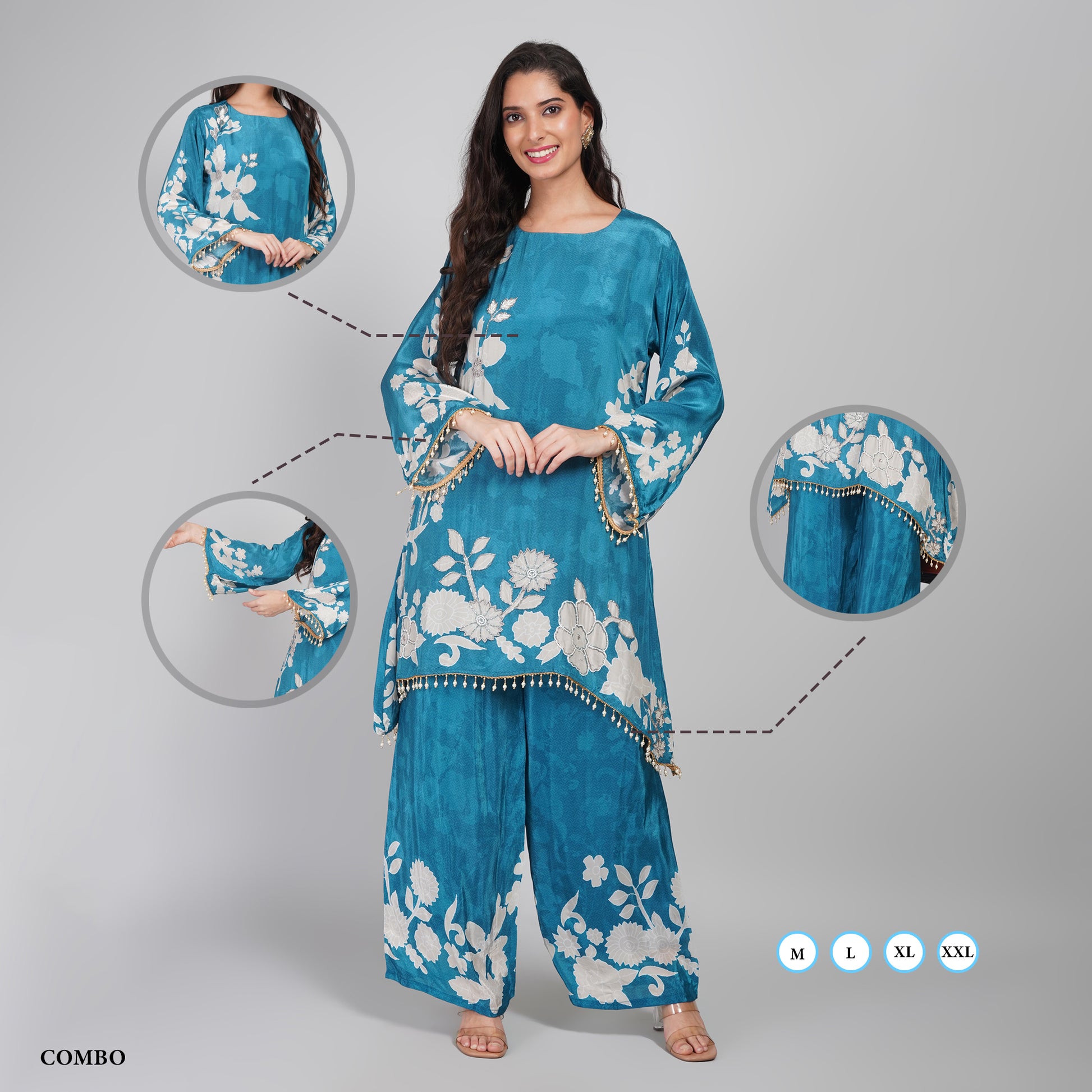 Upgrade your ethnic wardrobe with this Blue Silk Palazzo Kurta Set, crafted from premium silk fabric for a smooth, luxurious finish. The kurta features intricate Cutdana and moti hand embroidery, paired with a coordinated palazzo pant and matching dupatta. Perfect for weddings, parties, and festive gatherings, this ensemble combines elegance, comfort, and traditional charm.