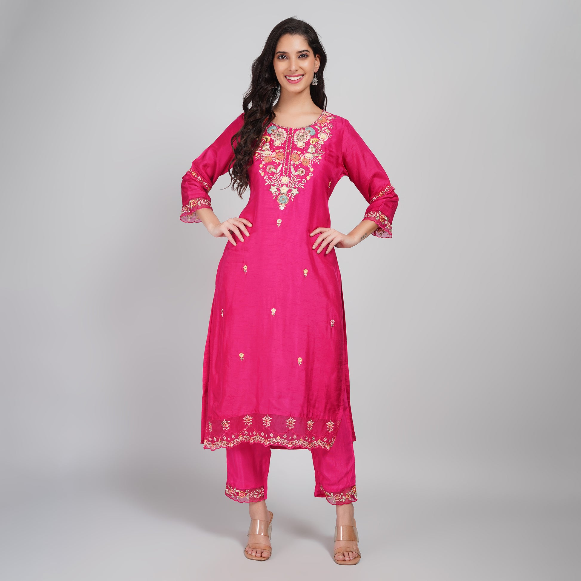 Add elegance to your ethnic collection with this Hot Pink Kurti Set. Featuring intricate embroidery with Moti work, a delicate organza dupatta, and net lace sleeves, this set combines traditional artistry with modern design. Comfortable and stylish, it is perfect for festive occasions, parties, or weddings.