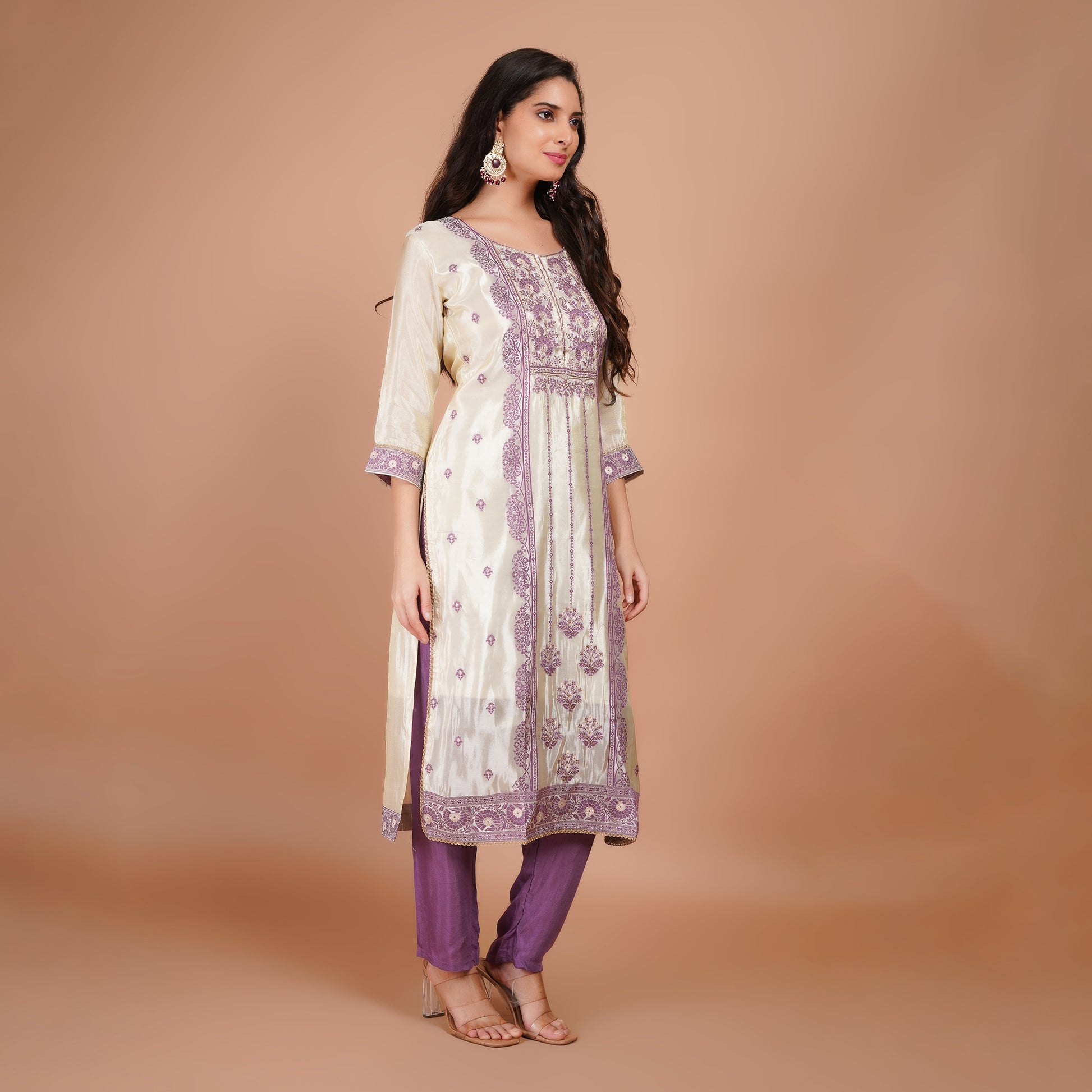 White & Purple Embroidered Kurta Set with Dupatta