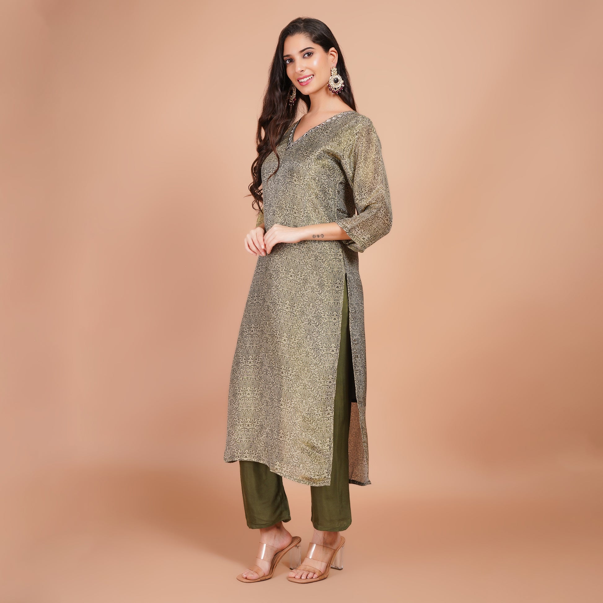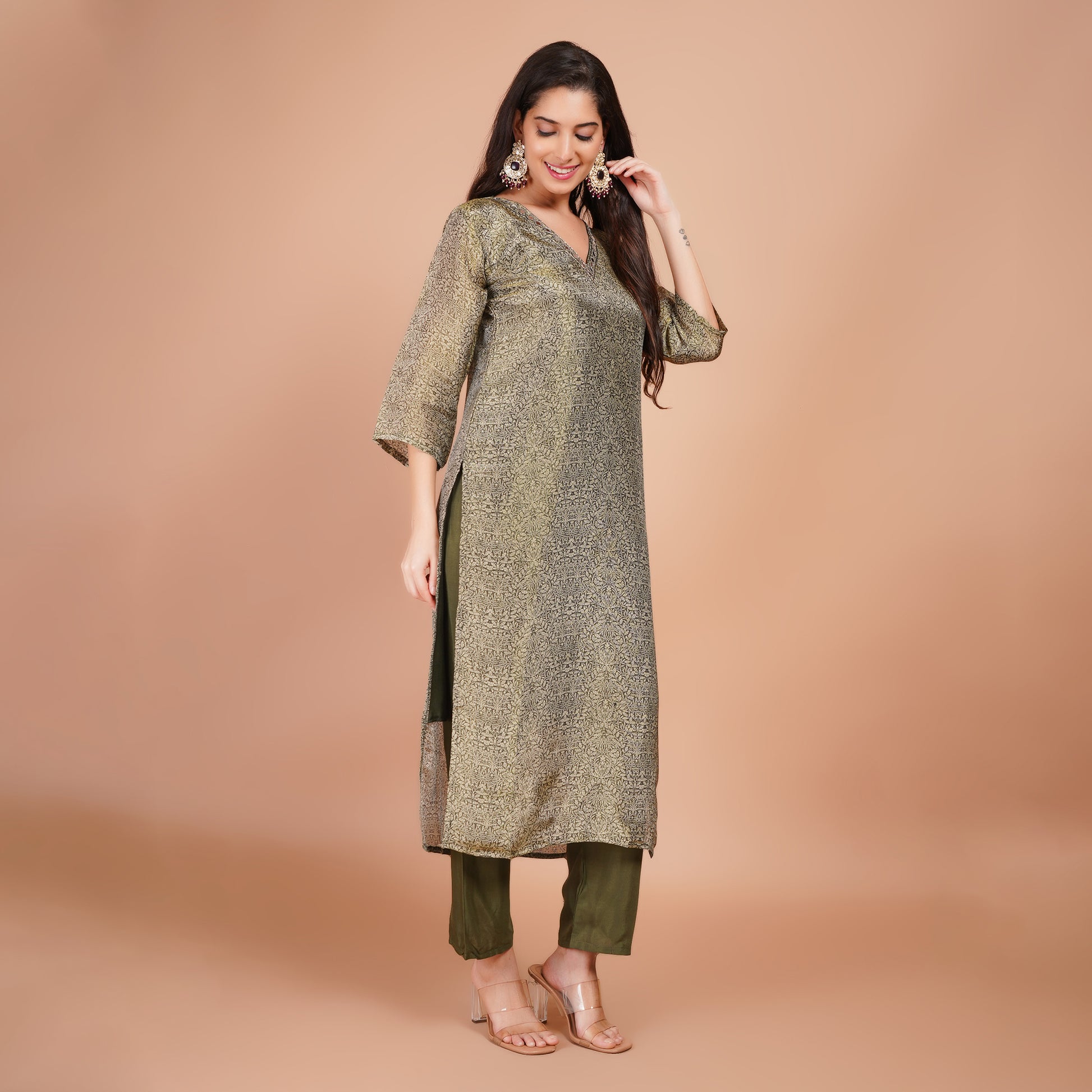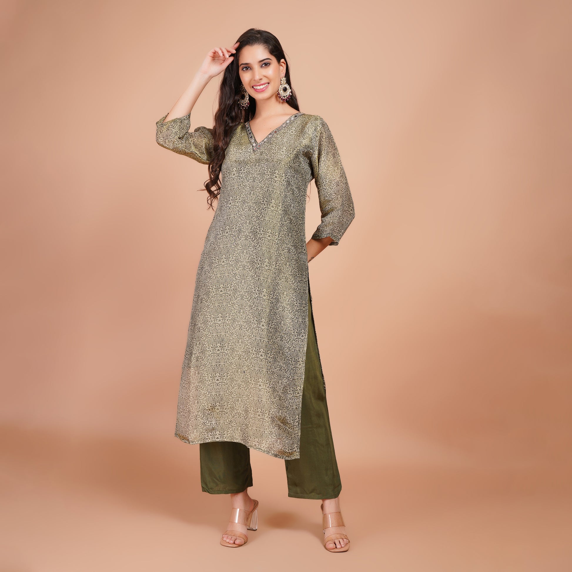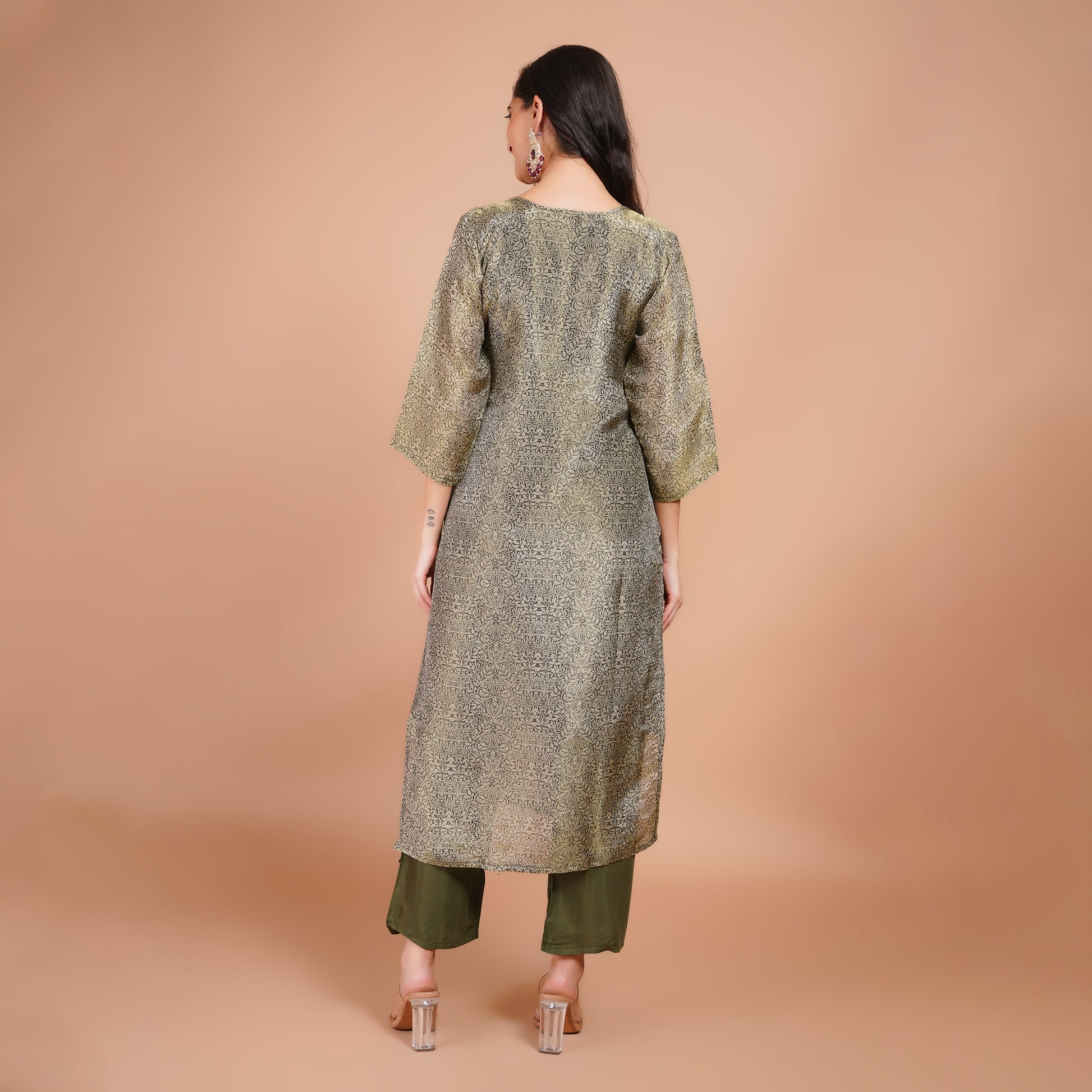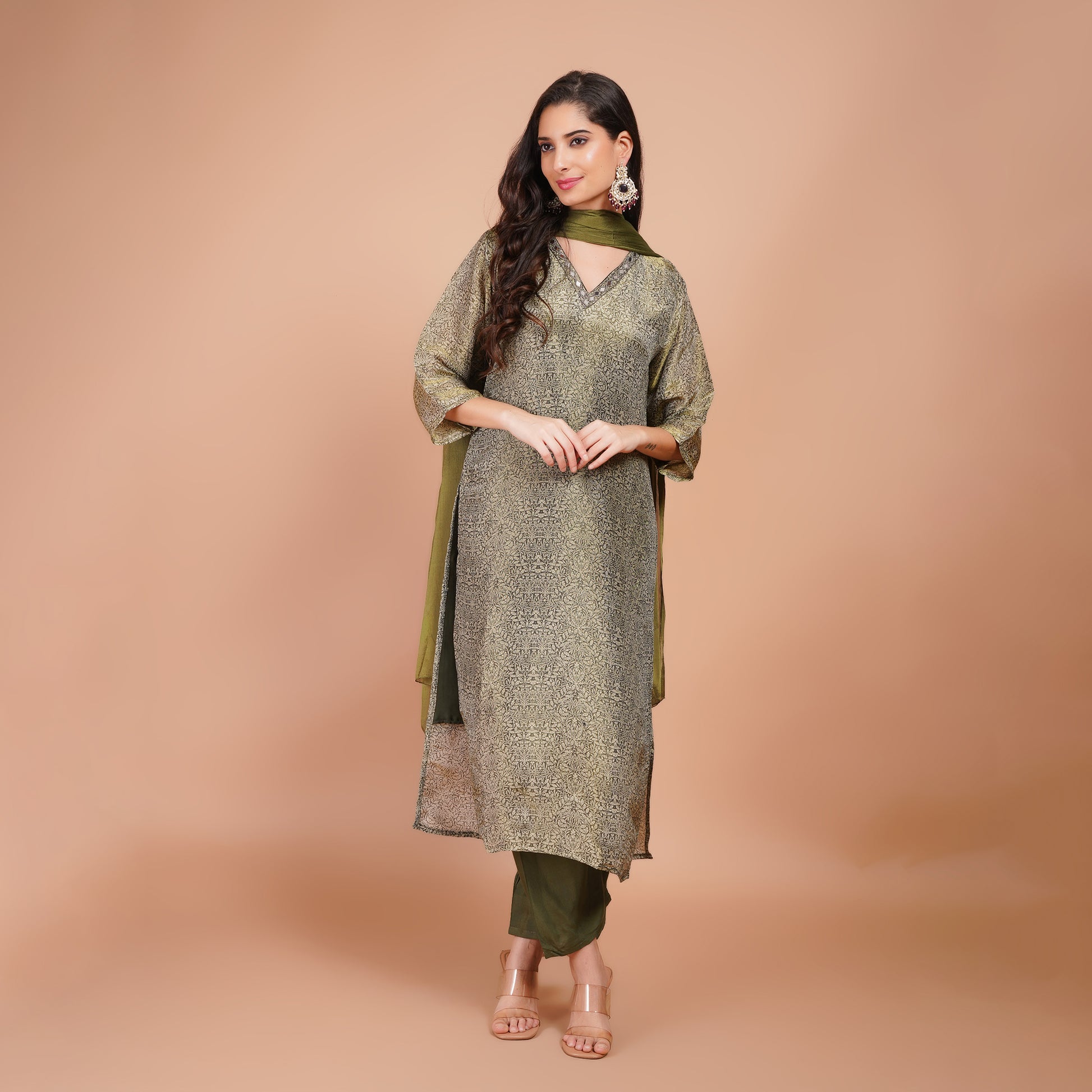 Upgrade your ethnic wardrobe with this elegant Olive Green Printed Kurta Set, crafted for both comfort and style. Designed with a chic kurta, matching pants, and a graceful dupatta, this set is versatile enough for festive occasions, office wear, or casual outings.