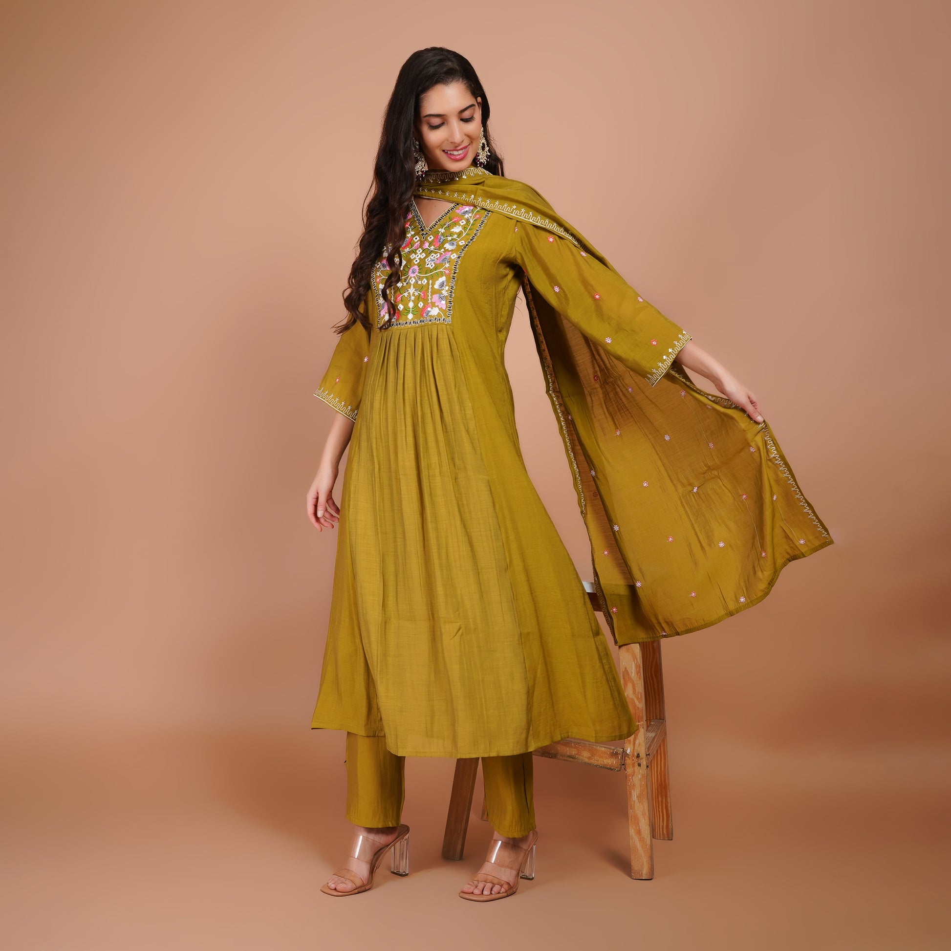 Make a stunning entrance with this Anarkali Suit Set, featuring exquisite handcrafted moti embroidery on the bodice that radiates elegance and festive charm. Paired with a beautifully detailed matching dupatta and coordinated pant, this ensemble is crafted from premium silk or silk blend for a luxurious drape and graceful flow. Perfect for weddings, festive celebrations, and cultural occasions, it combines traditional craftsmanship with modern sophistication to create a truly show-stopping ethnic look.