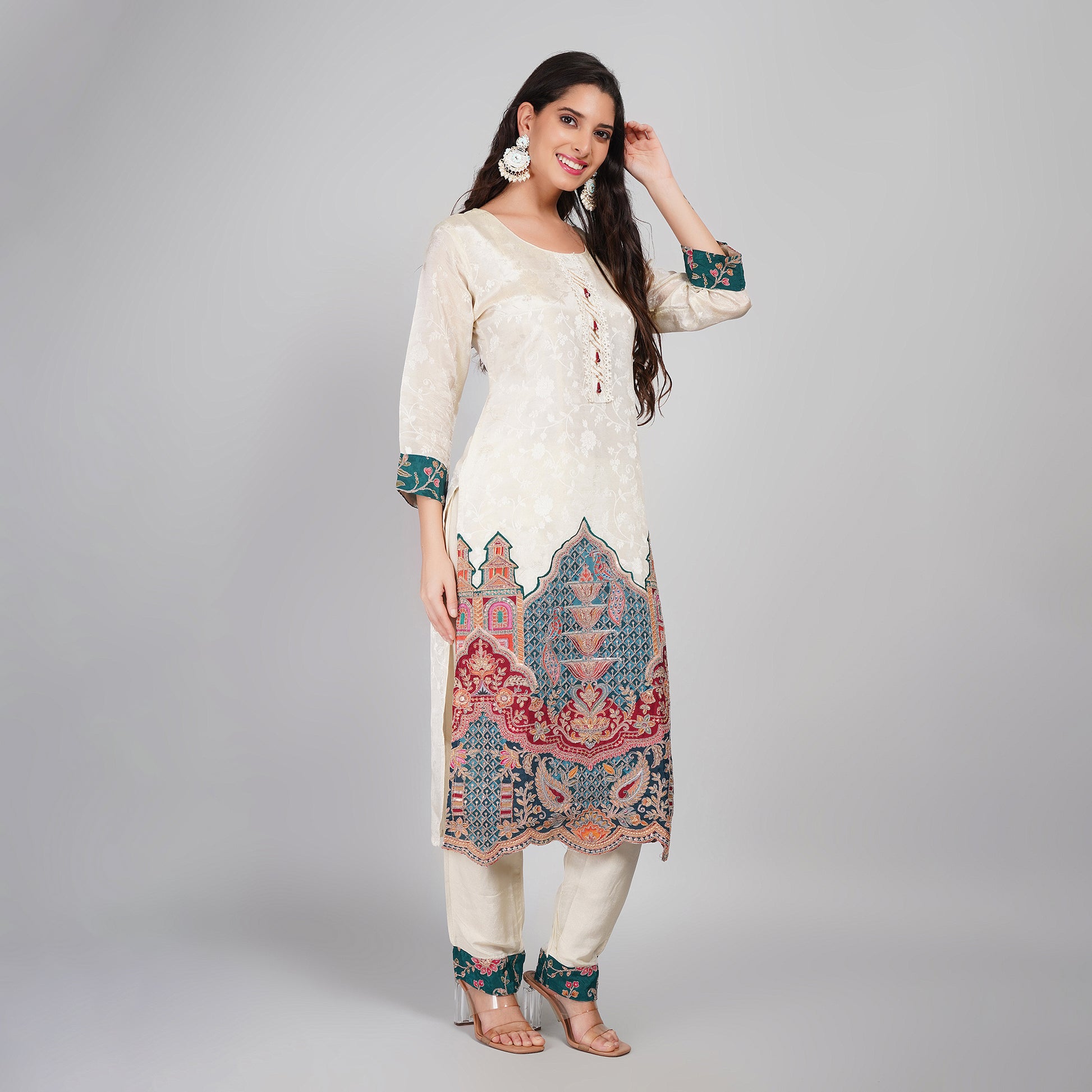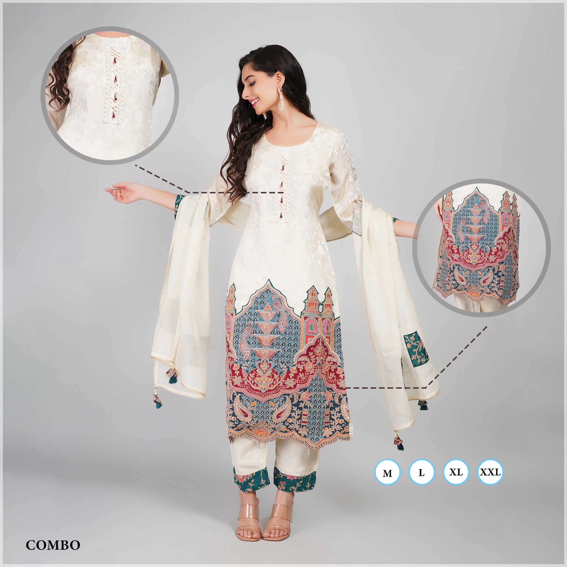 This Cream Self Silk Suit Set is crafted with delicate embroidery and elegant jari work, complemented by a matching dupatta and coordinated pant. Made from premium self silk, the outfit offers a luxurious drape and timeless elegance. Perfect for weddings, festive gatherings, and cultural occasions, this ensemble combines comfort, style, and traditional charm.