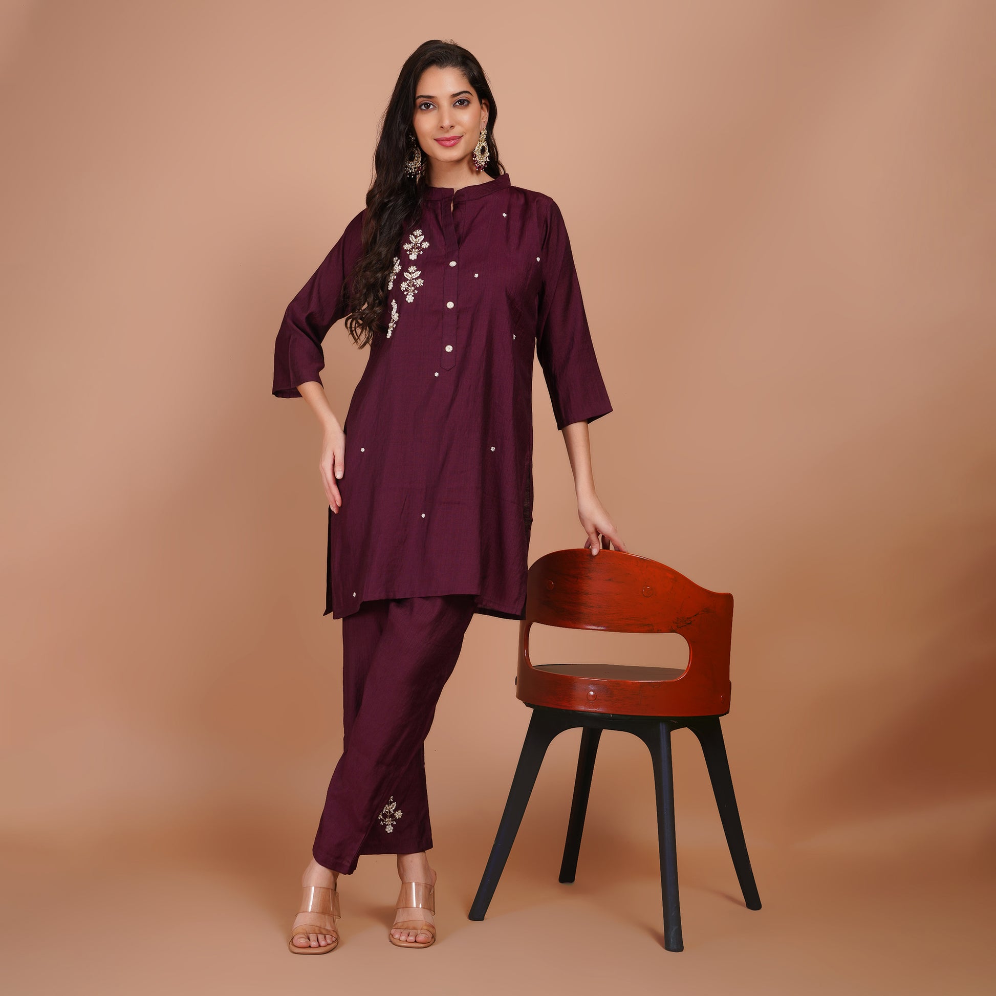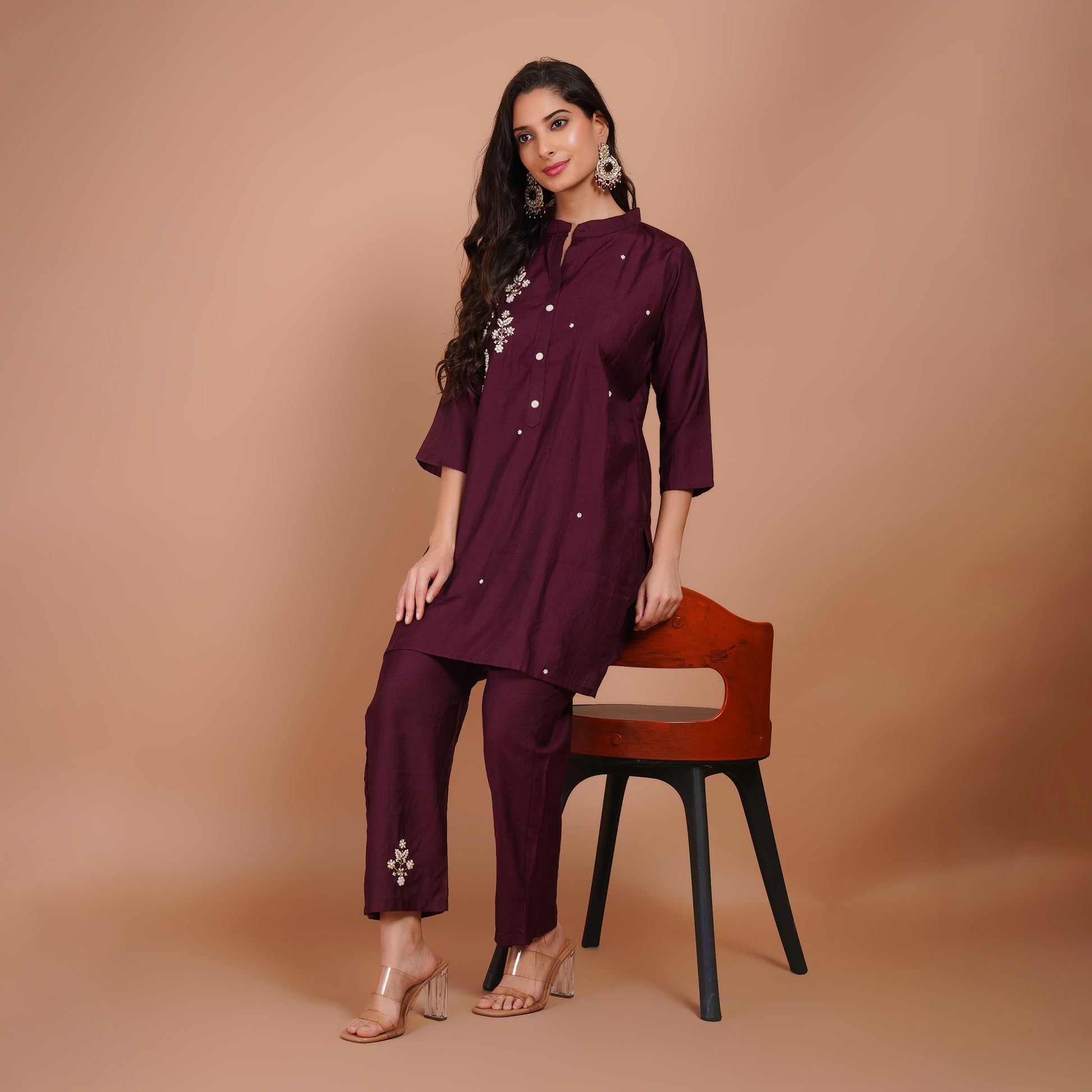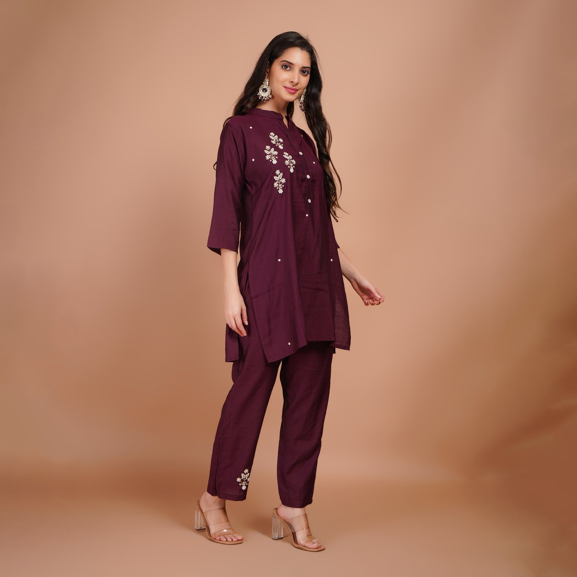 Step into elegance with this Purple Moti Cutdana Work Co-ord Set, designed for modern women who admire traditional detailing with a contemporary touch. Crafted from premium quality fabric, the outfit features handcrafted moti cutdana embellishments and intricate embroidery that elevate your festive look. The coordinated two-piece design offers a perfect balance of comfort and sophistication, making it ideal for weddings, festivals, and special gatherings.