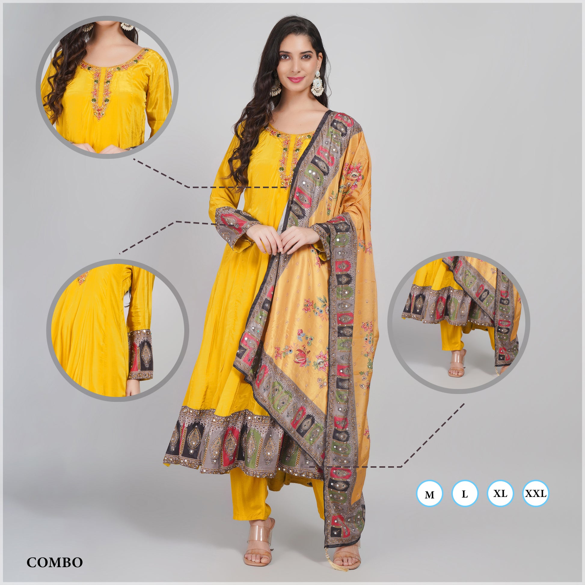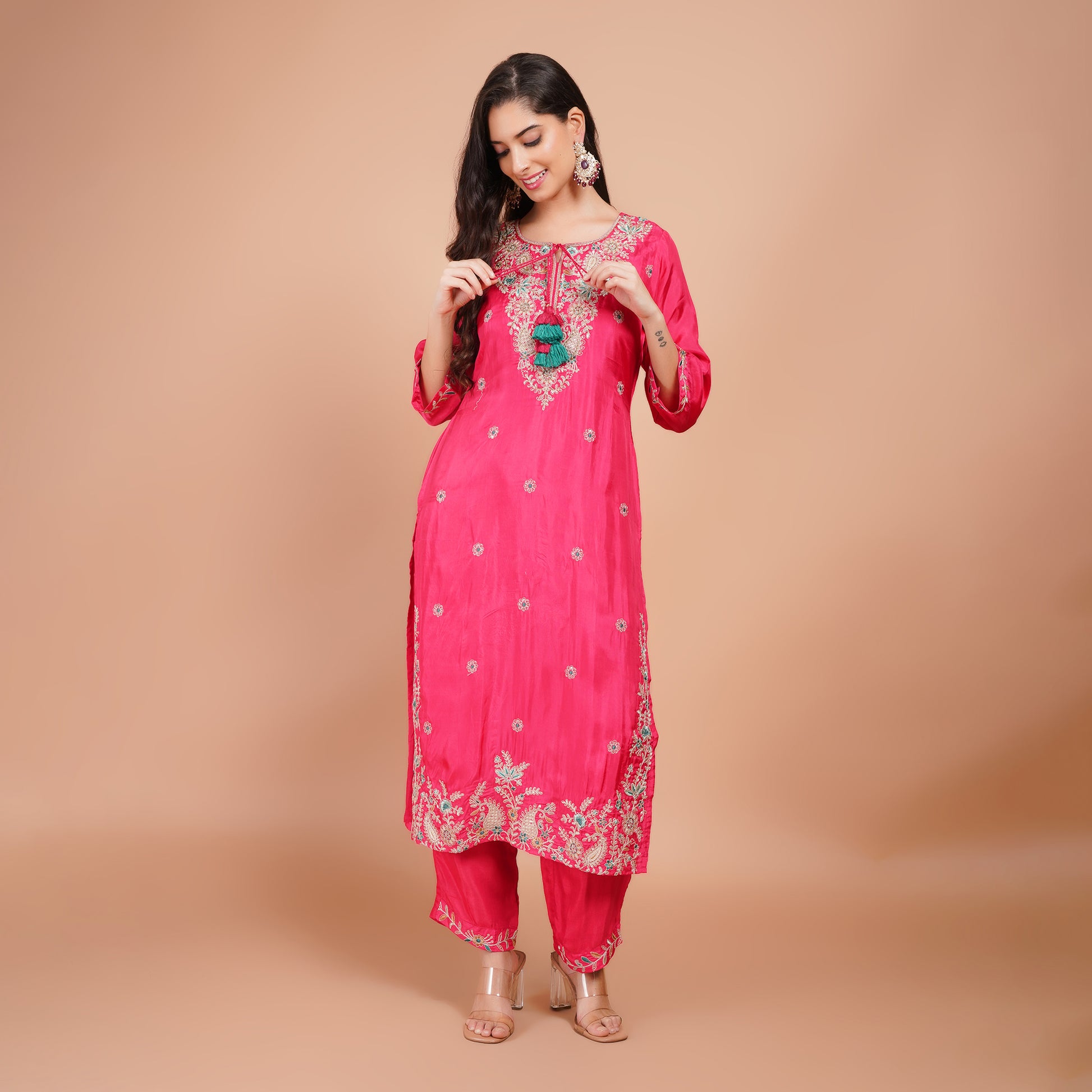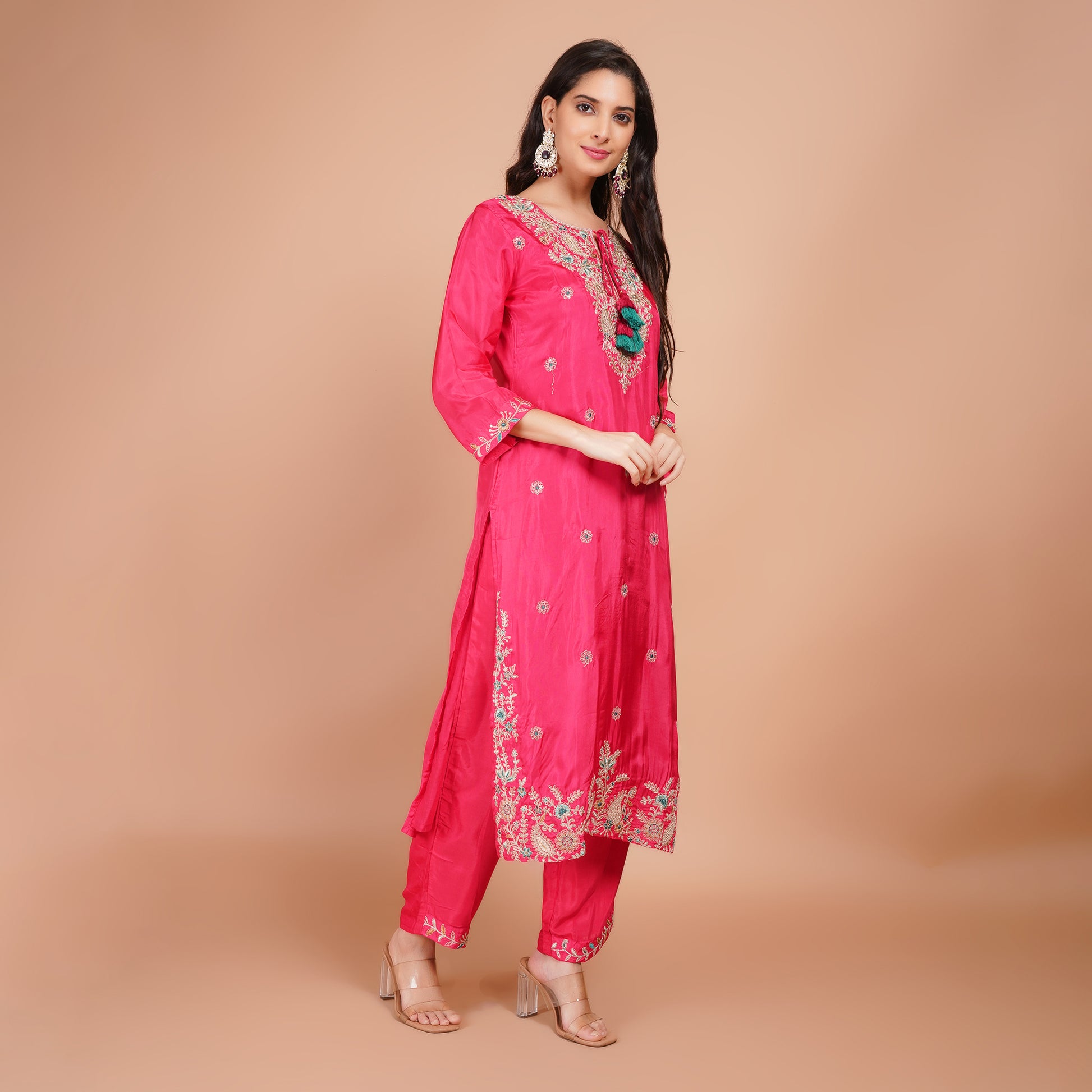 Elevate your ethnic wardrobe with this elegant Silk Kurti Set. Featuring Dabka embroidery on the kurti, a delicate organza dupatta with embroidery, and matching pants, this set combines traditional craftsmanship with modern style. Perfect for festive occasions, parties, or casual gatherings, it offers a comfortable and flattering fit.