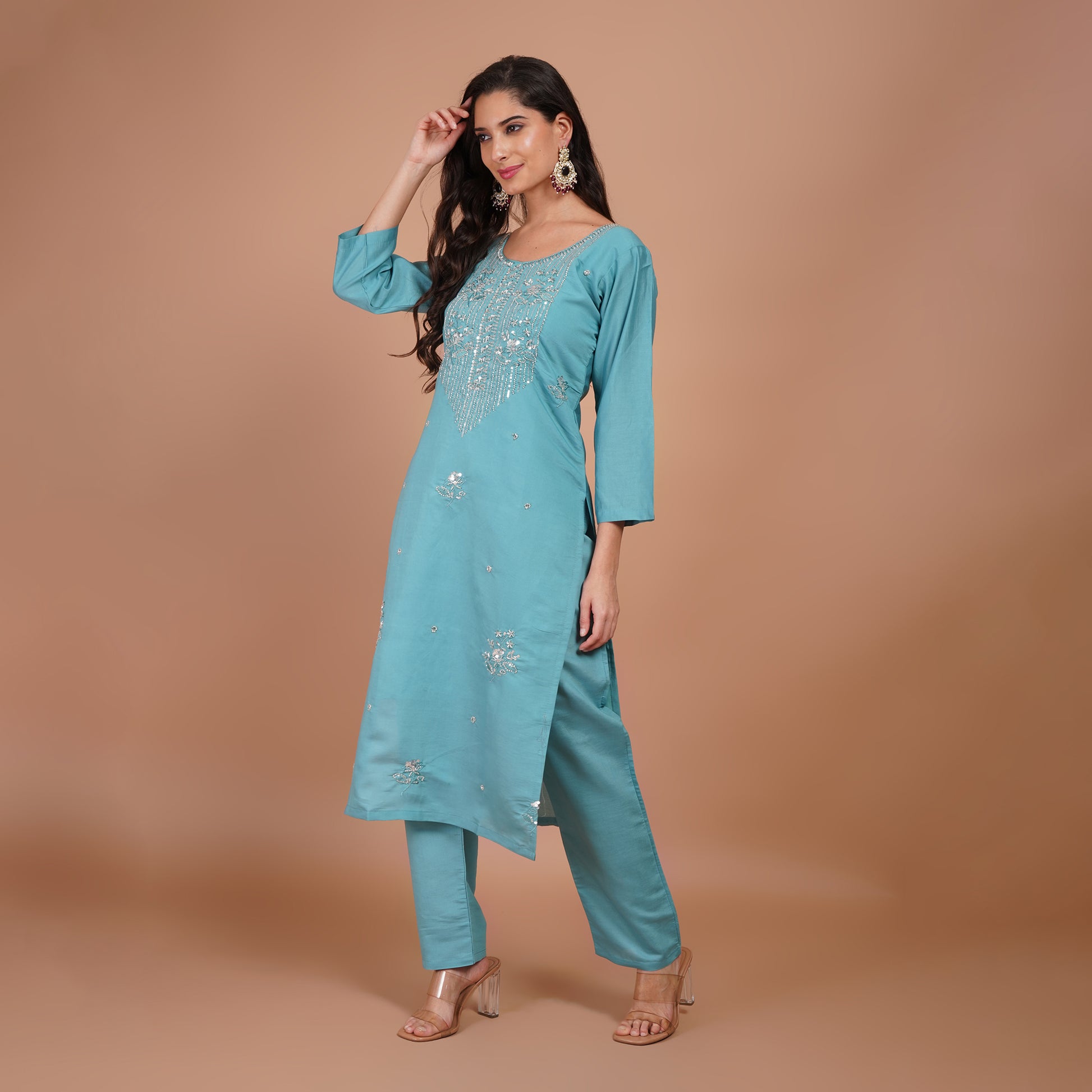 Add a touch of timeless charm to your ethnic wardrobe with this Sky Blue Organza Dupatta & Pant Set. Featuring exquisite moti cutdana handwork and delicate embroidery, this outfit blends traditional craftsmanship with a contemporary touch. Crafted from lightweight and breathable organza, it is perfect for weddings, festive occasions, and celebrations.