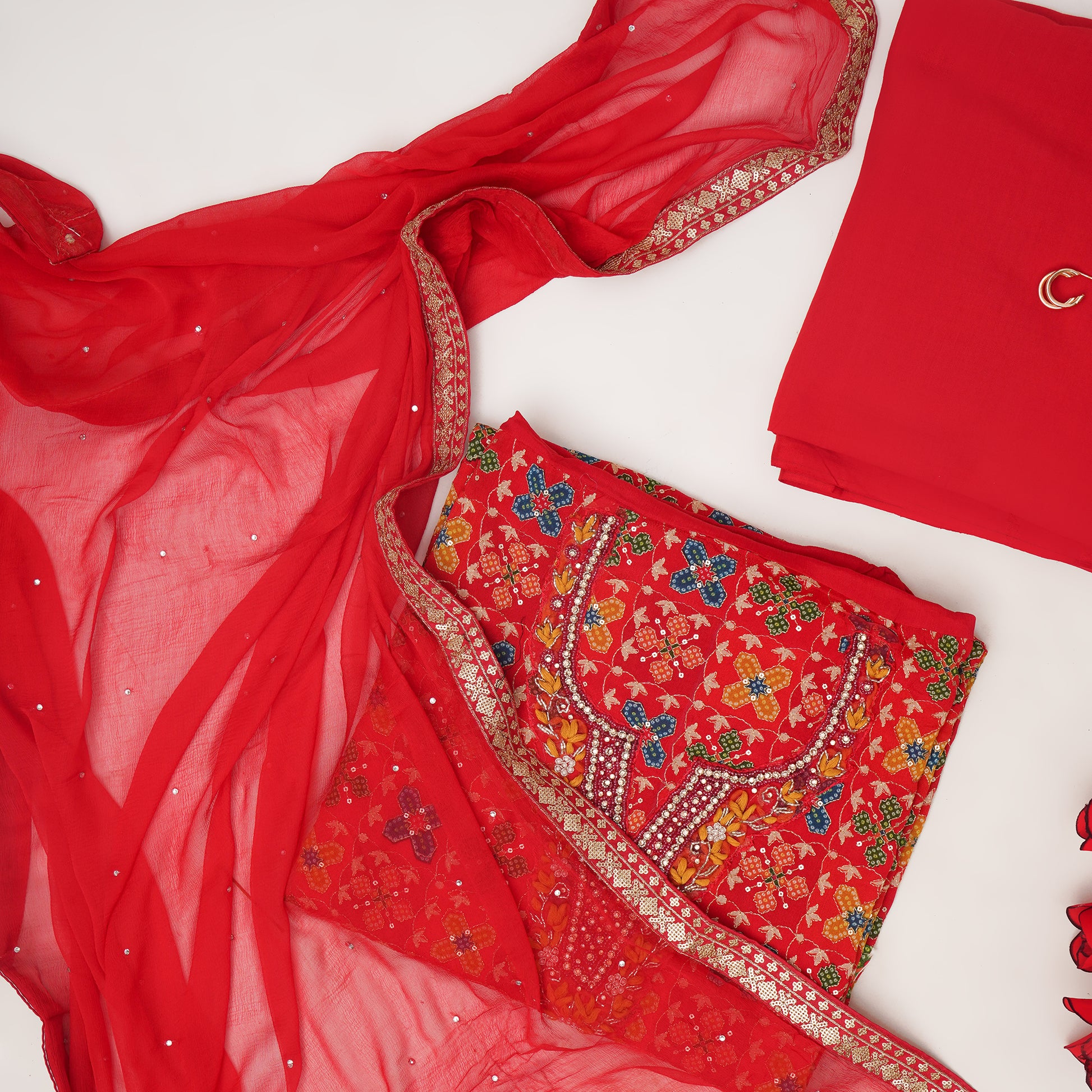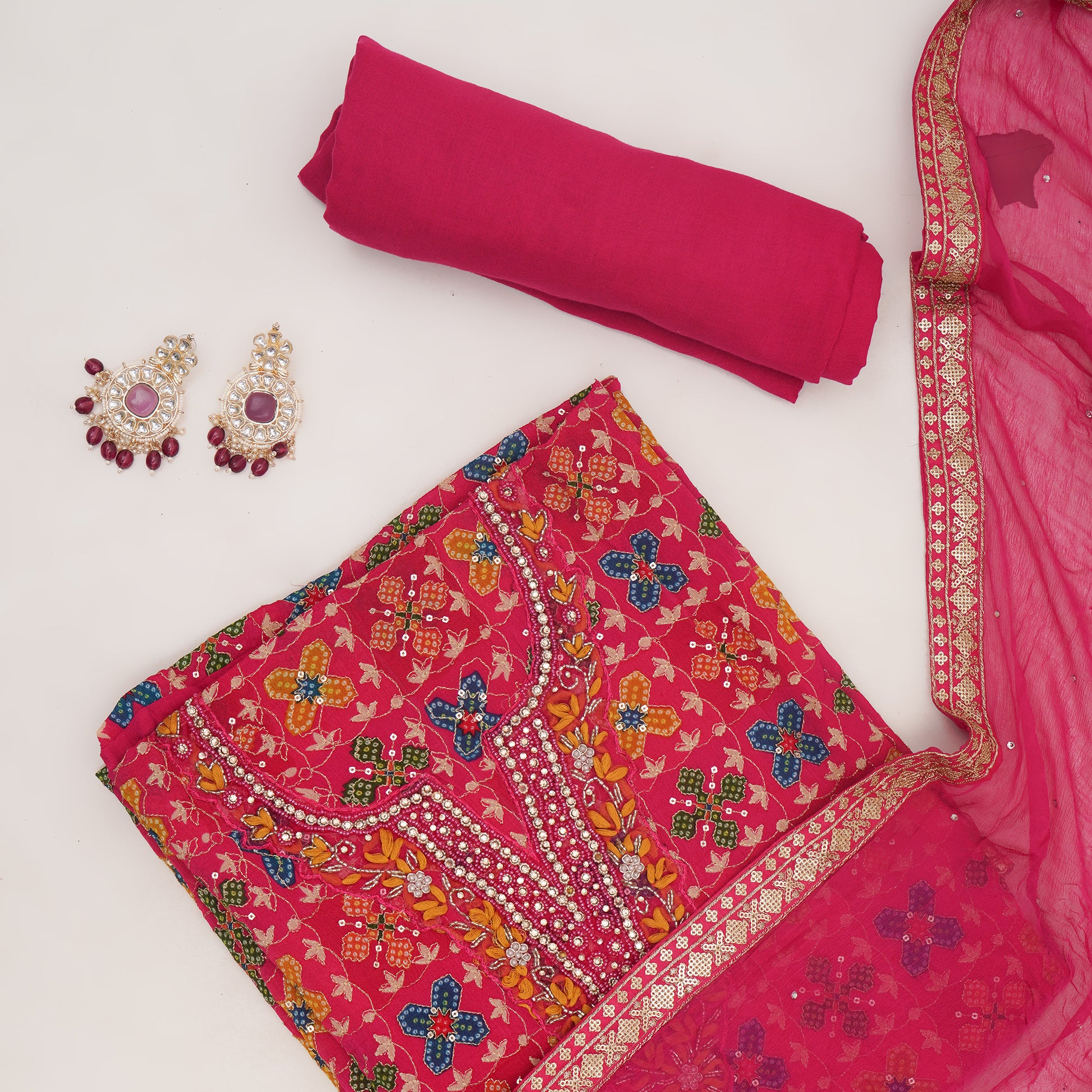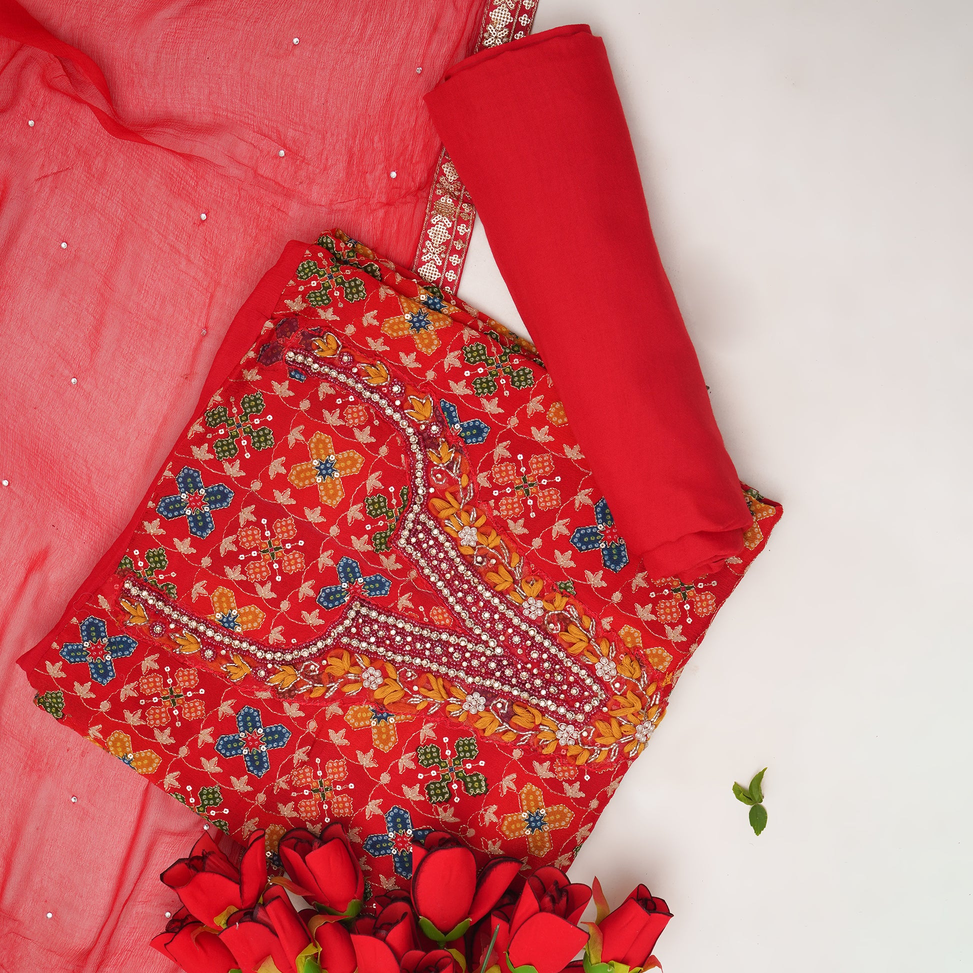 Elevate your ethnic collection with this Ajmera Unstitched Suit Fabric, crafted with beautiful Jari Moti embroidery. Available in multiple vibrant shades, this piece is perfect for custom tailoring into your unique style.