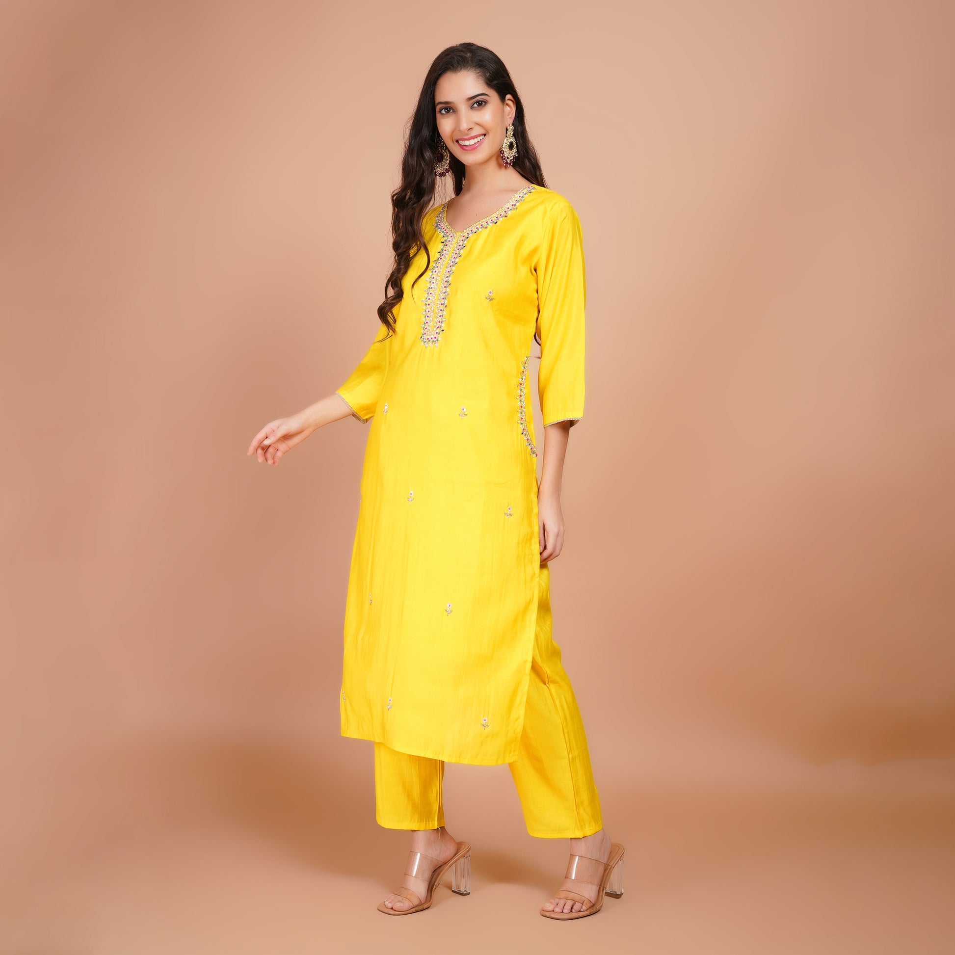 Bring brightness to your festive collection with this Yellow Organza Dupatta & Pant Set. Highlighted with delicate cutdana hand embroidery on the dupatta, the outfit exudes elegance and charm. The lightweight organza fabric paired with a comfortable pant strikes the perfect balance of tradition and style, making it an ideal choice for weddings, festive gatherings, and special occasions.